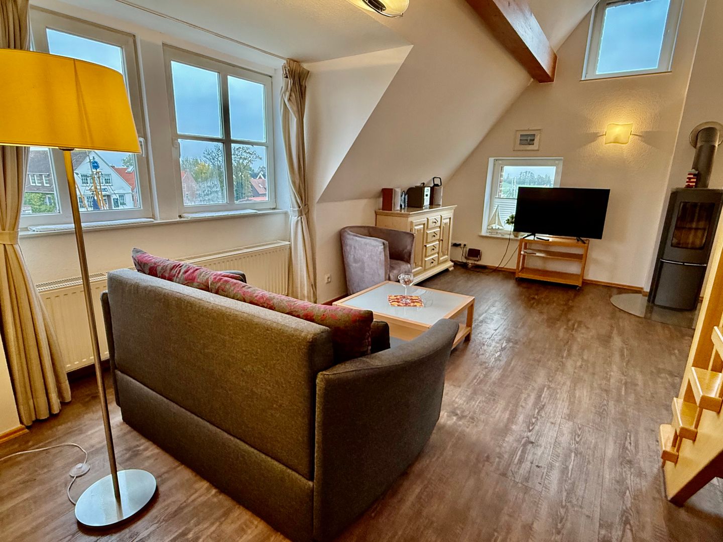 Die Nichtraucher-Ferienwohnung „Rysum“ liegt im Vorderhaus im Dachgeschoss und bietet Platz für 2 Personen. Genießen Sie den wunderschönen Blick auf den Kutterhafen und die historische Häusergalerie.