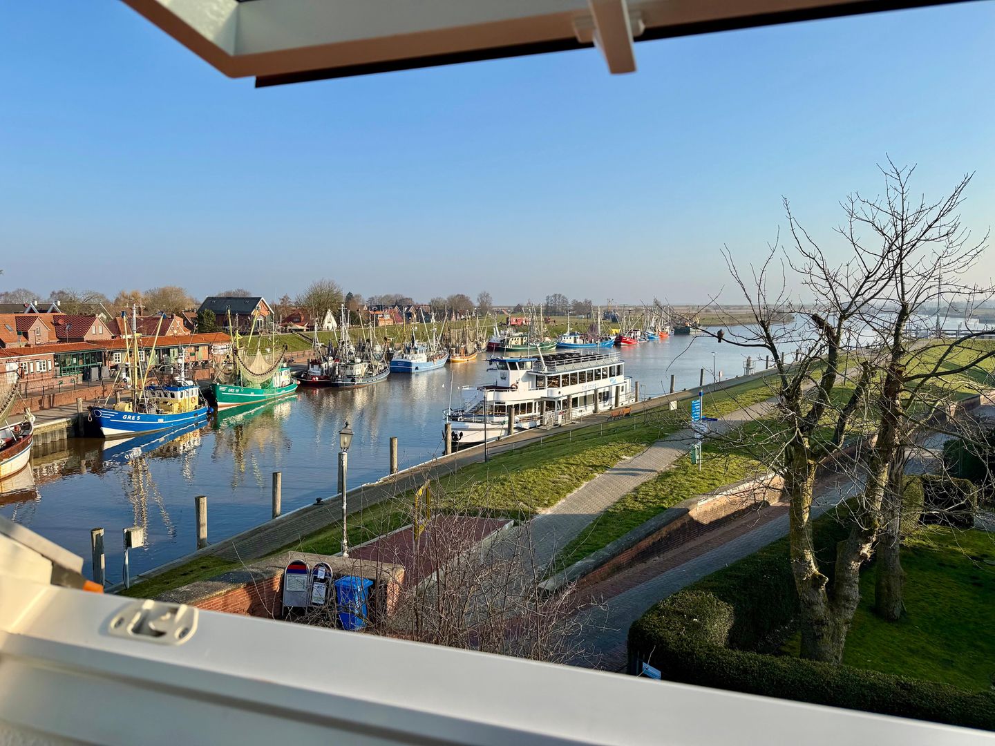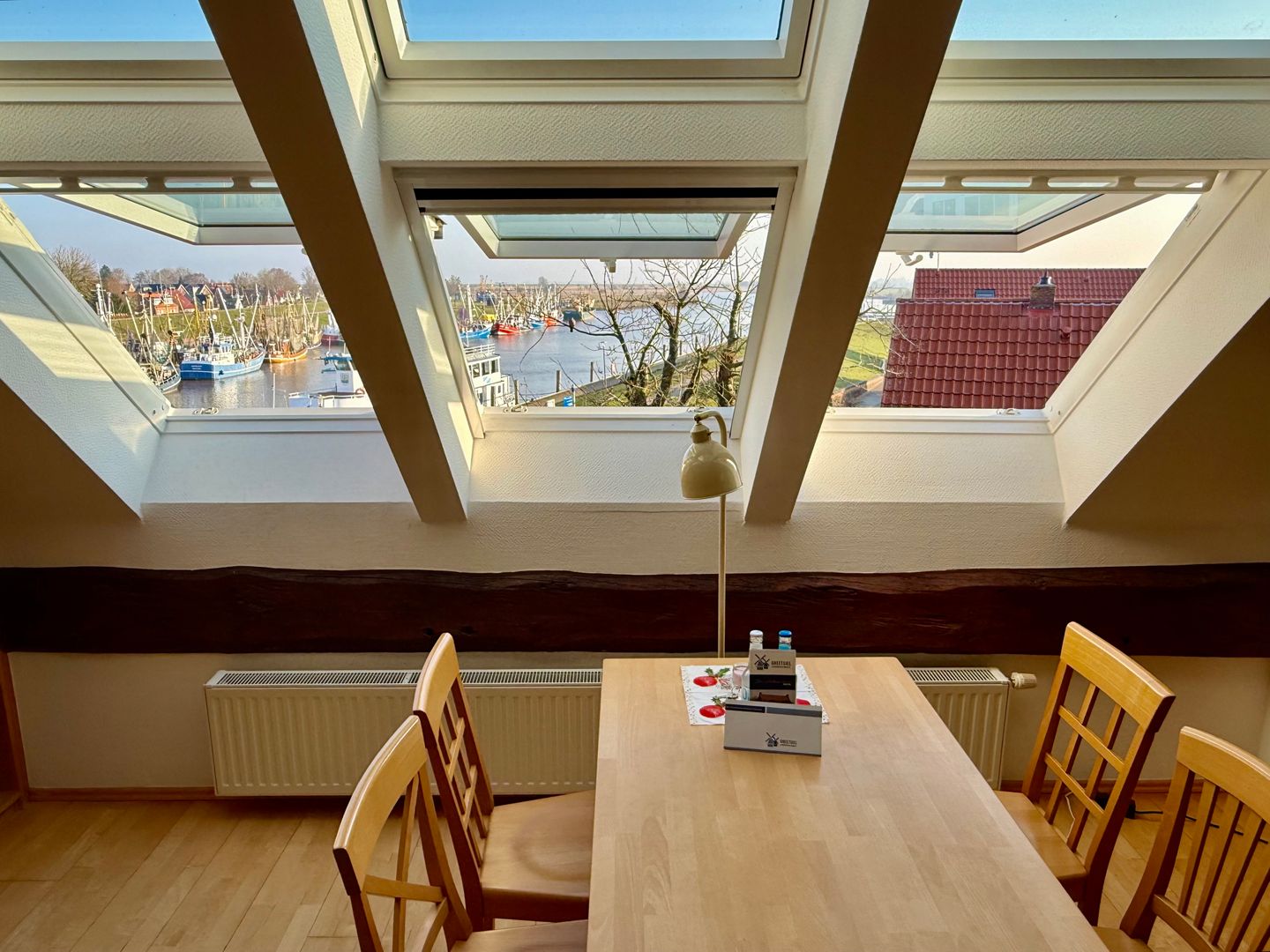 Die ruhige, komfortable Ferienwohnung „Woquard“ liegt oben zur Deichseite und bietet Platz für bis zu 4 Personen. Genießen Sie den Blick auf den Kutterhafen und die Hafenausfahrt.